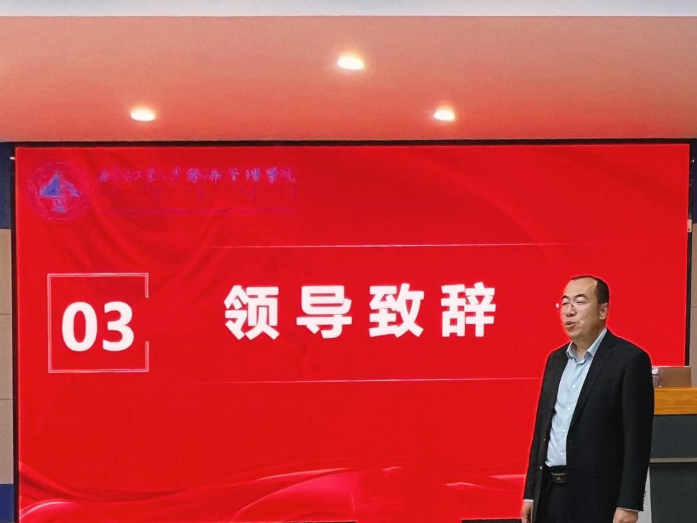 经济管理学院党委副书记、副院长徐德生首先致辞。他充分肯定了第九届联合会在过去一年中的辛勤付出与卓越成绩,并对新一届联合会寄予殷切期望,希望同学们继续发扬“薪火相传”的精神,勇于担当、敢于创新,为学院和同学搭建更广阔的平台。